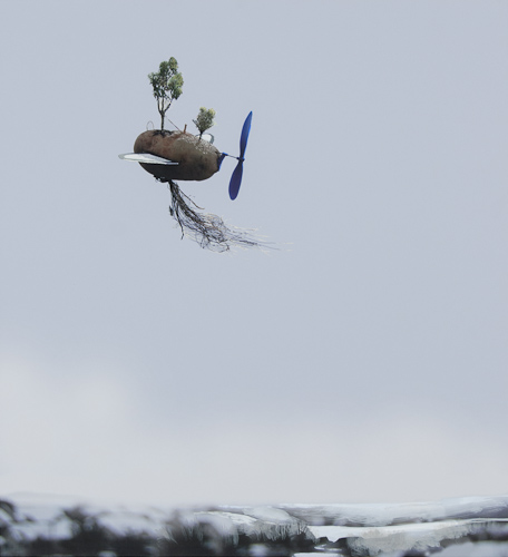 Escape Vehicle: Potato With Propeller, 2012, shows a potato with wings, a blue propeller and two small trees sticking out of it flying from right to left over what looks like the snow-covered hills of upstate New York.