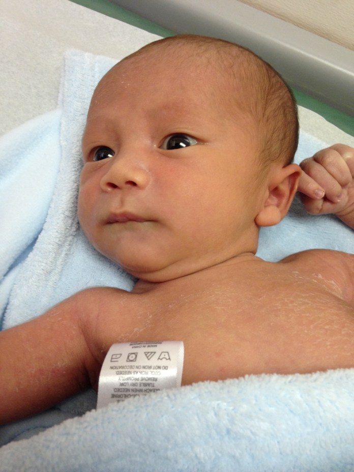 pops out of the womb with a full head of downy, brown hair