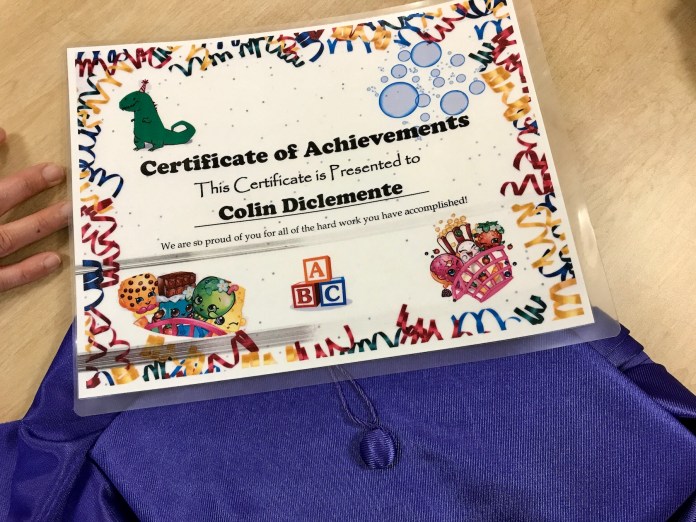 I don’t usually post family-related stuff on this blog, but I wanted to share that we celebrated Colin’s seventh birthday on Sunday. And last Friday morning, Colin completed his feeding therapy program at the Golisano Center for Special Needs. The amazing staff there gave him presents, a card, a certificate, and a cap and gown—which he refused to wear.