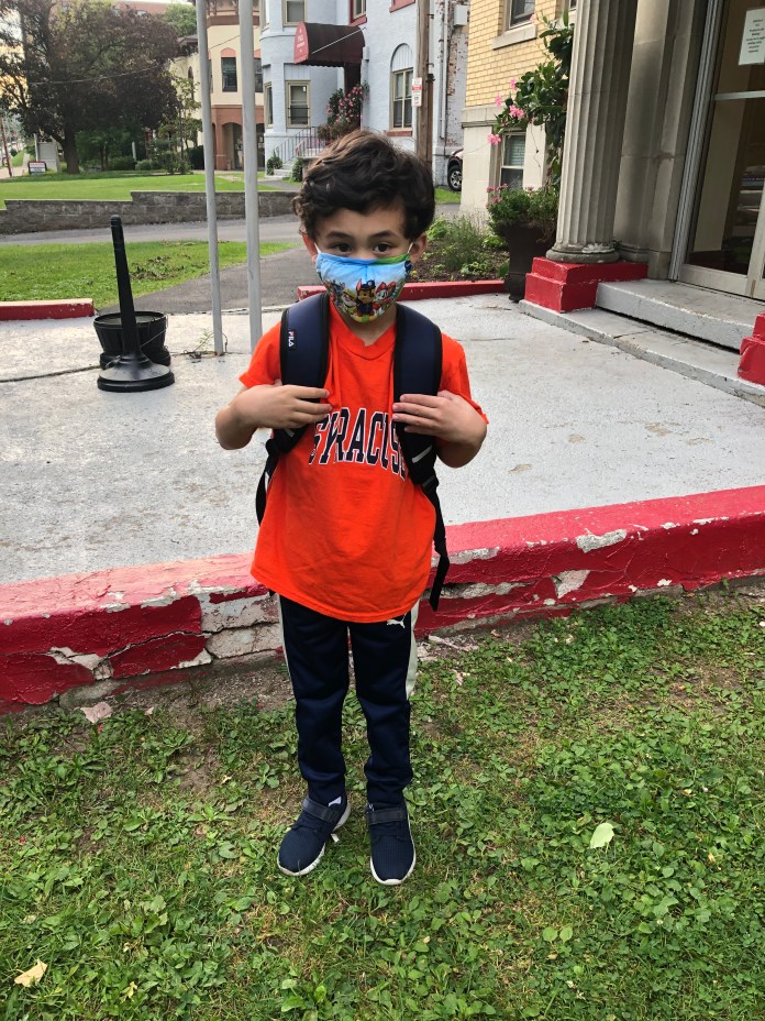 “Ah, put up your mask when you go on the bus and when you’re inside school,” Pam tells him. He listens and pulls up his mask. Colin is in kindergarten, and he has autism.