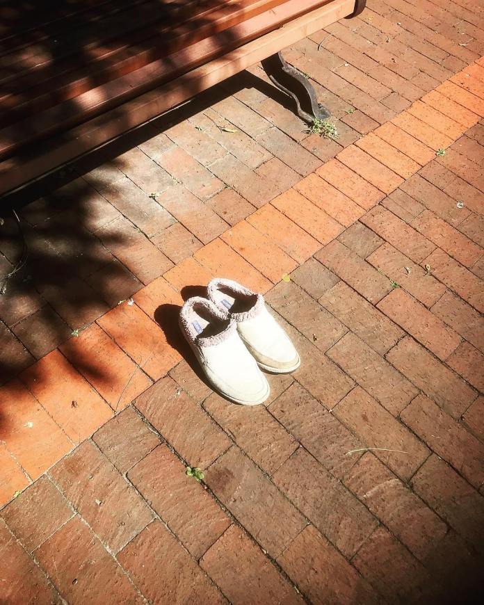 Slippers found near a park bench in downtown Syracuse. Photo by Francis DiClemente.