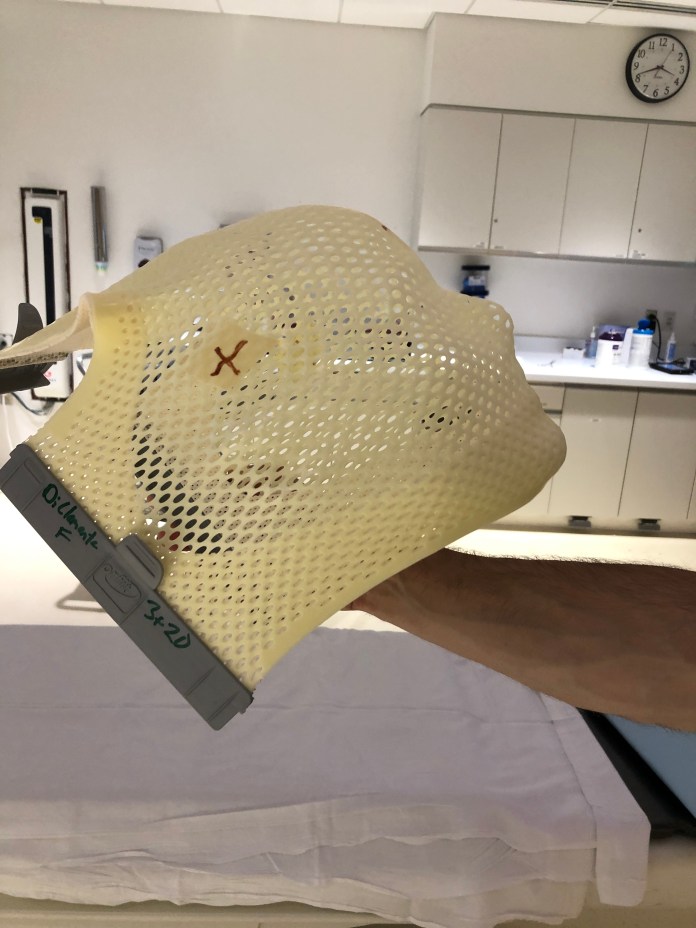 The test itself took very little time; I remained still while the machine moved my body in and out of the tube. When it was done, they pulled me out and the male tech held up the mask so I could see it. I thought it looked like a goalie mask and I asked if could snap a picture with my phone.