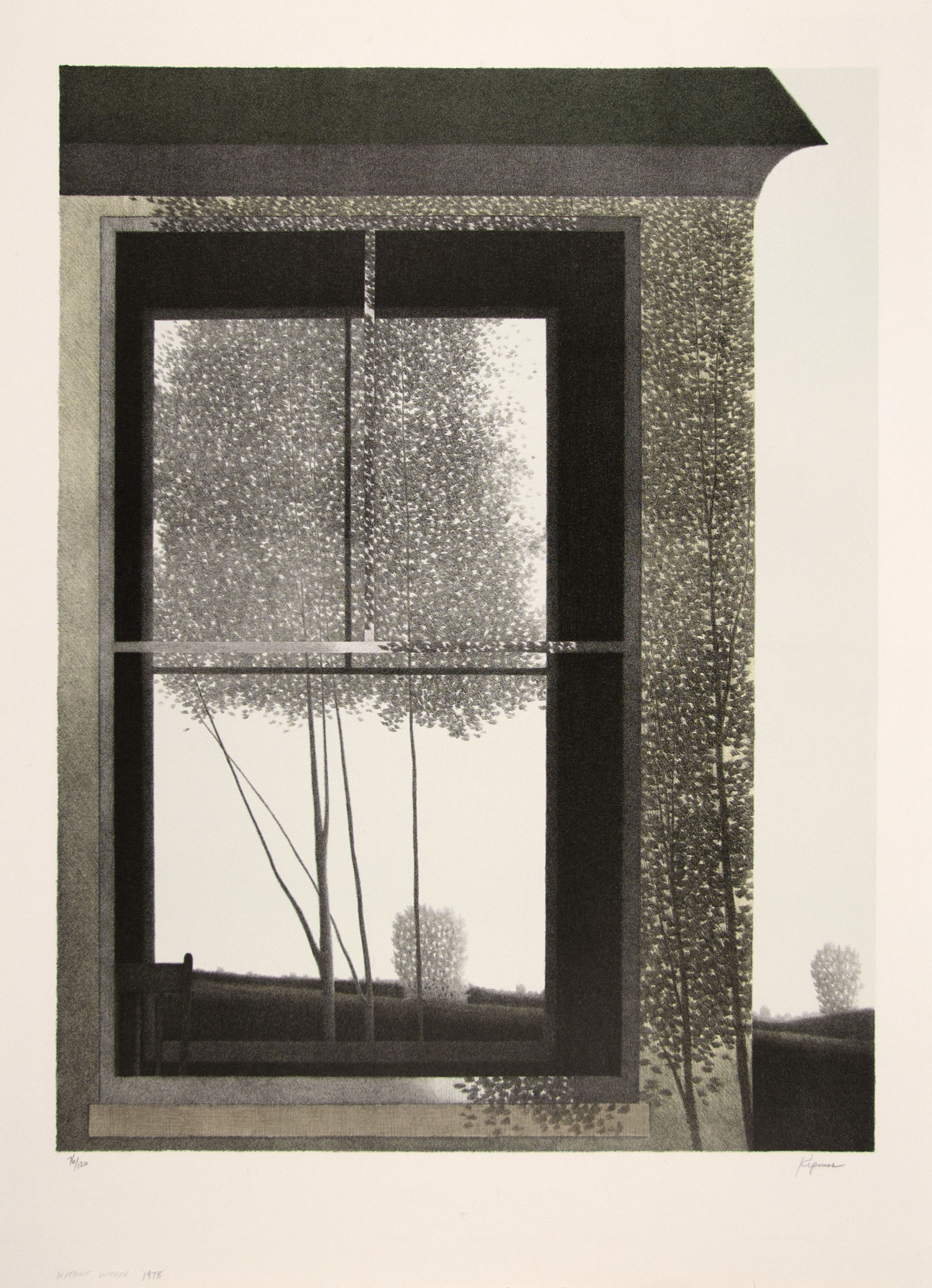 Quiet Intersections: The Graphic Work of Robert Kipniss presents more than 30 prints depicting interior still life scenes and rural landscapes composed of plants, windows, houses, trees, hills and fields. Most of the works are black and white, while others have subtle earth tones like mauve, green and brown.