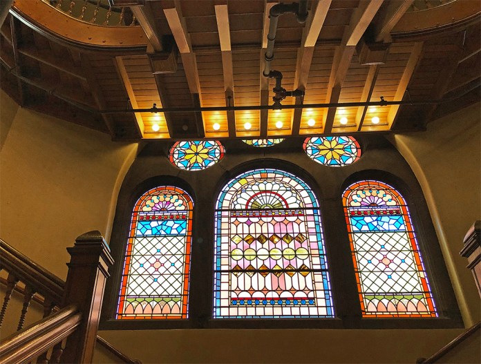 Stained-glass window inside Crouse College at Syracuse University. Photo by Francis DiClemente.